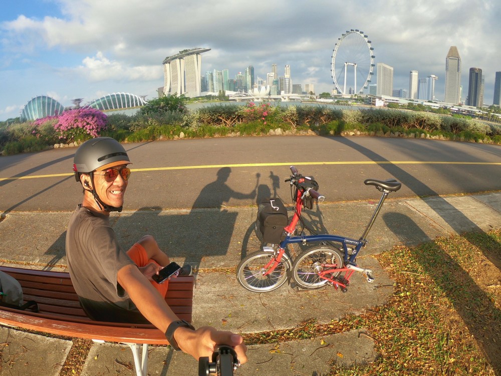 Karena dengan mengikuti mereka ini, saya jadi menemukan satu trail khusus sepeda yang cukup populer di kalangan goweser di sini. Yakni trail melalui Gardens By The Bay di sisi Timur. Jadi saya menyusuri teluk di daerah Marina Singapura, yang mana dari sisi sini saya bisa menyaksikan city scape Singapura yang tersohor. Lengkap dari Marina Bay Sands, Singapore Flyer sampai dengan gedung-gedung jangkung di Financial District. Cakep! Saya sempat duduk-duduk di bench pinggir jalur sepeda ini untuk menikmati pemandangan.
