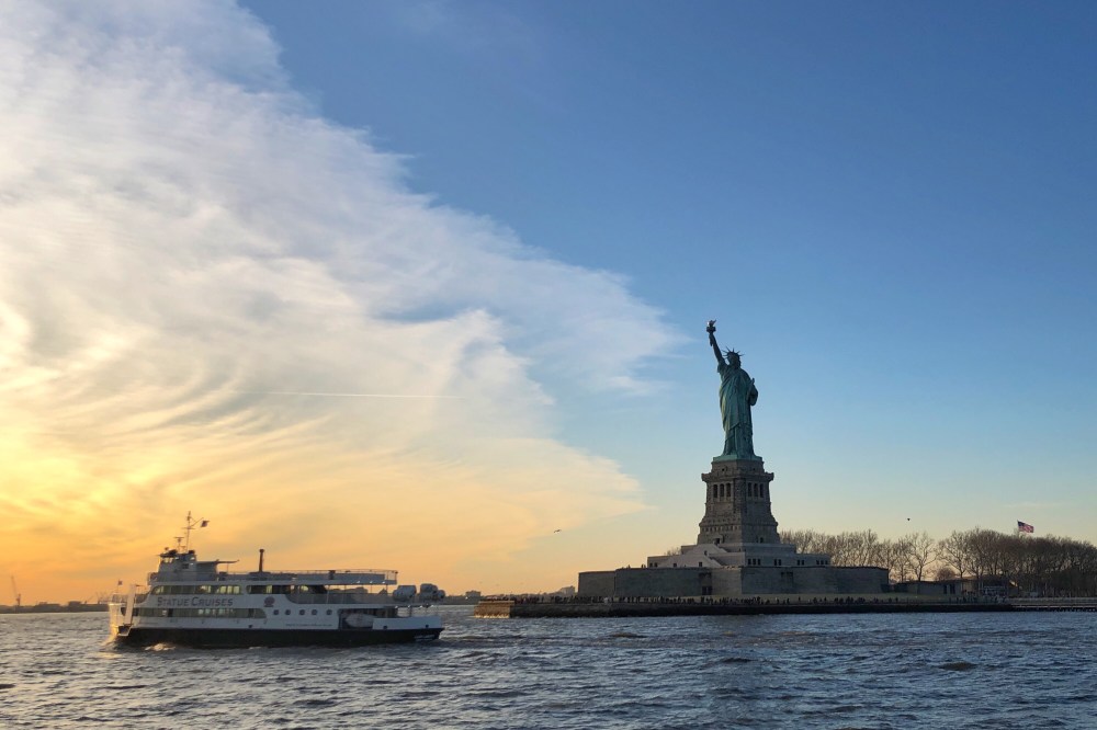 Kita naik cruise jam 03.30 sore. Dengan waktu 1,5 jam perjalanan ternyata waktu ini membawa kita mendapatkan sunset scene yang indah. Matahari musim dingin yang terbenam menciptakan semburat warna warni di horizon. Saya pun bahagia bisa mendapatkan momen mengabadikan Statue of Liberty dengan backdrop warna langit yang menawan.