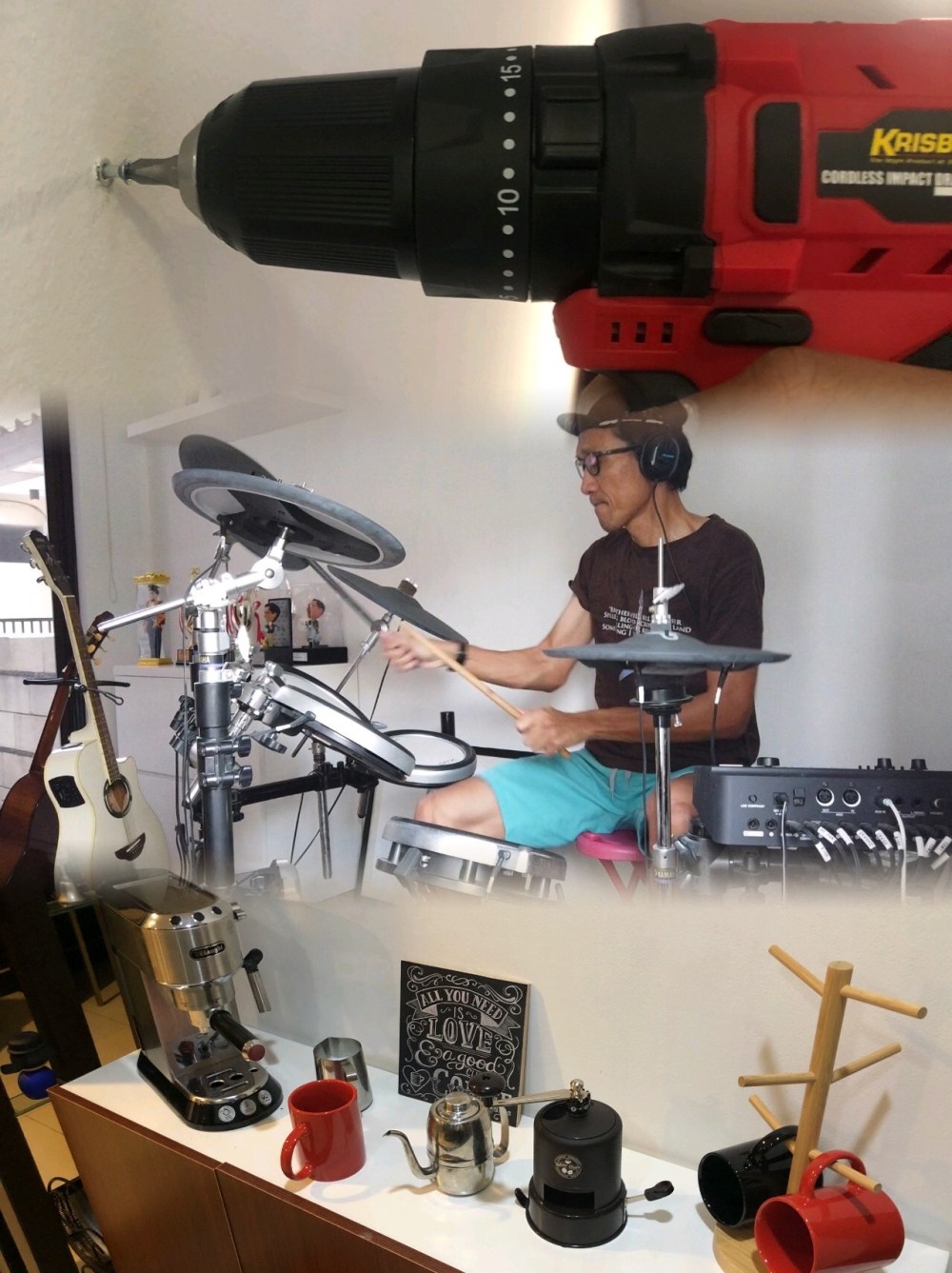 Dan terakhir adalah perangkat drums listrik saya. Selama ini ruang musik saya lebih menjadi seperti gudang. Tempat barang-barang tak terpakai diletakkan. Dengan punya banyak waktu di rumah, saya jadi senang kembali bermain drums. Bahkan sekarang sampai asyik memenuhi request teman-teman untuk memainkan lagu-lagu rock jaman dulu di #DrumSync series saya di Instagram story. Belum pernah lihat? Monggo silahkan di follow 🙂