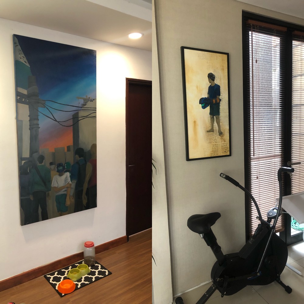 Salah satunya adalah memasang lukisan karya Rafif di rumah. Selama ini lukisan-lukisan itu masih teronggok di ruang musik. Weekend demi weekend berlalu, dan tetap saja niat memasang lukisan tersebut tidak terlaksana. Kalah dengan kesibukan akhir pekan lain yang umumnya bepergian.