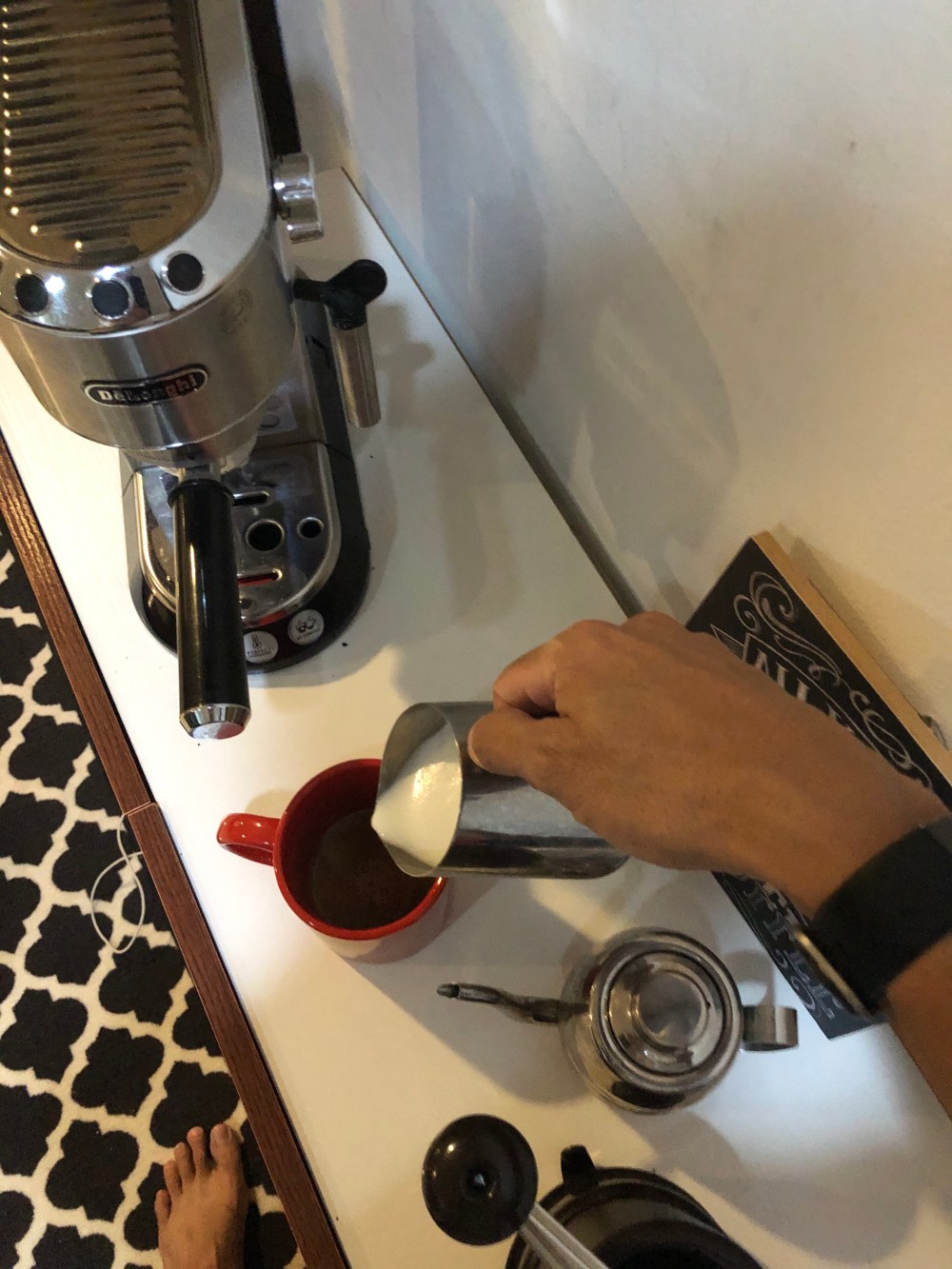 Lalu mesin espresso De Longhi saya. Beberapa bulan ini tidak pernah saya pakai. Teronggok di sudut terlapisi debu. Eh dengan seringnya bekerja di rumah, yang mana minum kopi adalah keharusan setiap pagi dan usai makan siang, maka saya pun kembali menggunakannya. Apalagi pojok kopi saya di dekat dapur sudah tersedia tempatnya.