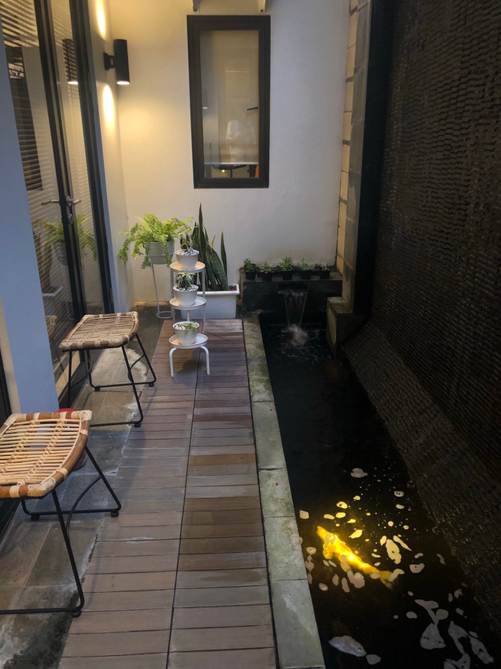 Sudut kolam Koi saya yang sebelumnya sepi hiasan, kini mendadak cantik dengan beberapa pot tanaman dan tempat duduk rotan. Selalu di rumah tampaknya membuat istri memperhatikan sudut-sudut yang tadinya diabaikan.