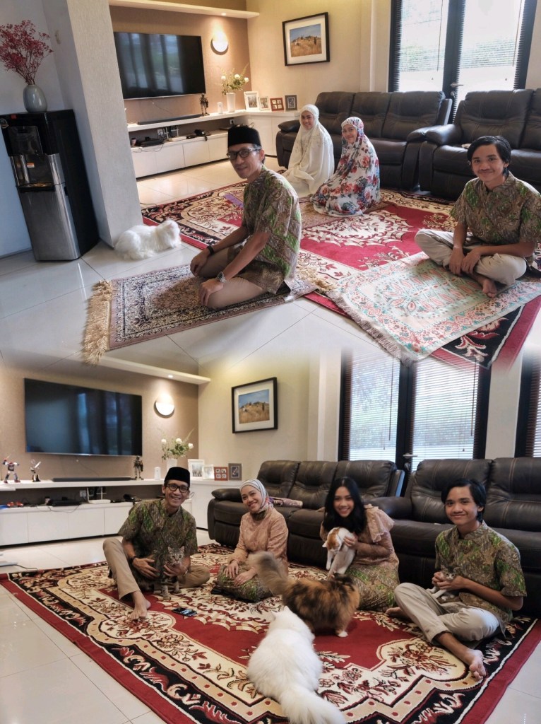 Tak menyangka hari ini kami ternyata kejadian shalat ied di kompleks rumah. Hanya beda dengan bayangan kami. Karena shalat ied-nya #dirumahaja. Tidak di masjid, tidak pula bersama tetangga. Hanya kita berempat, disaksikan para anak bulu.