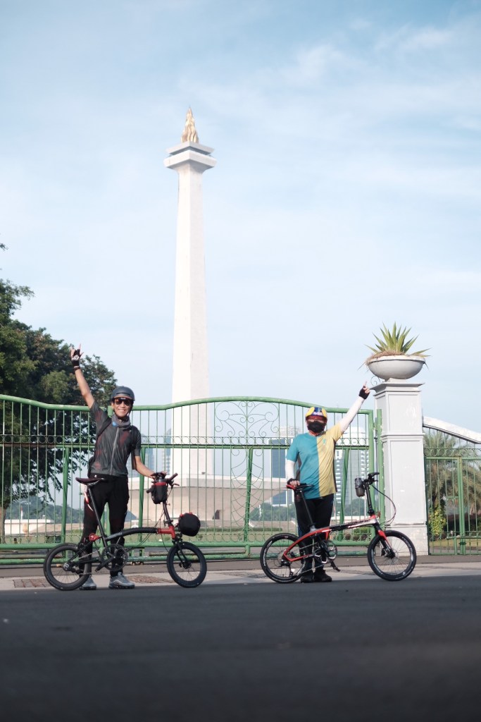 Karena situasi Jakarta yang masih dikenai pembatasan sosial berskala besar, maka kita tidak bersepeda dengan kelompok besar. Cukup berdua saja dengan teman saya, Andre, yang bertemu di Monas. Oleh karenanya kita sebut ini “Pembatasan Sosial Bersepeda Berdua”.
