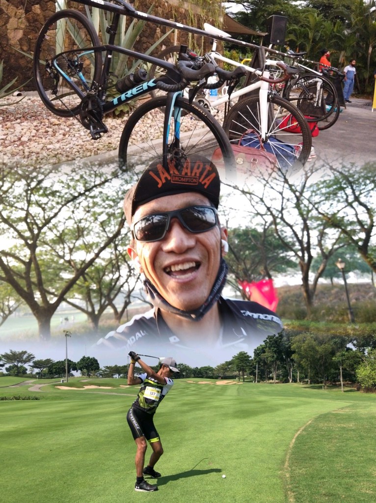Kalau biasanya triathlon itu mempertandingkan tiga cabang olahraga endurance: renang, bersepeda dan lari, maka yang saya ikuti pagi ini minus renang. Diganti golf.