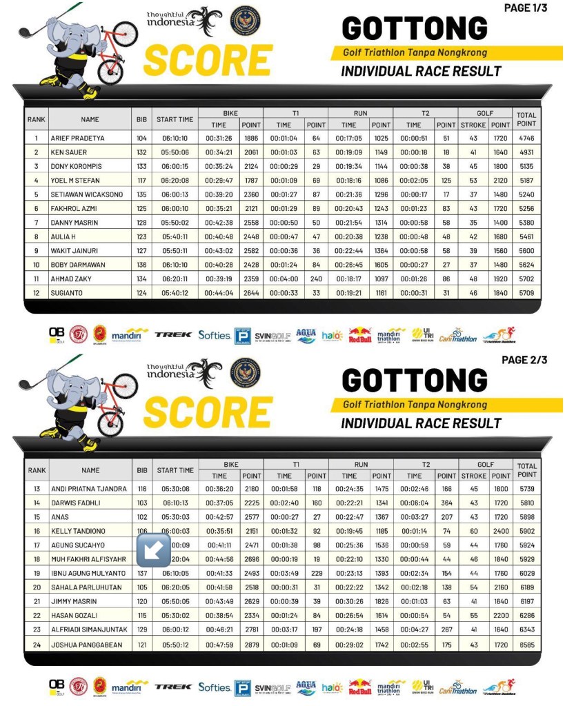 Beberapa hari setelah mengikuti GOTTONG – Golf Triathlon Tanpa Nongkrong, saya mendapatkan hasil resmi dari panitia. Walaupun saya juga mengukur waktu melalui aplikasi Strava dan jam Garmin 945 saya, tapi hasil resmi ini dapat membandingkan performa saya dengan peserta lain.