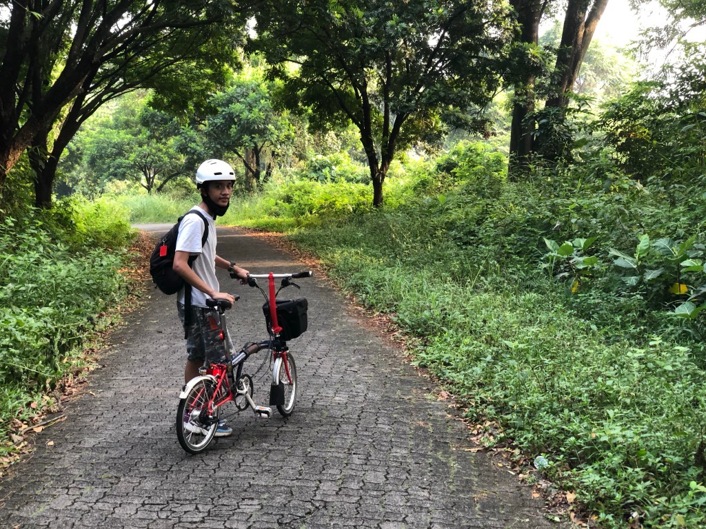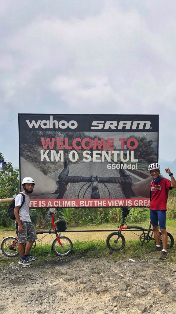 Rafif yang akhir-akhir ini kalah intens dalam berolahraga sepeda dibanding saya, terlihat kesulitan mendaki tanjakan. Otot pahanya sempat keram. Jadi berulang kali kita harus berhenti untuk beristirahat atau menuntun sepeda. Saya beberapa kali sempat menawarkan Rafif untuk berhenti. Lipat sepeda, cari ojek atau Grab untuk kembali ke hotel. Tapi ia berkali-kali menolak. “Kita coba aja Pah. Sudah sampai sini”.