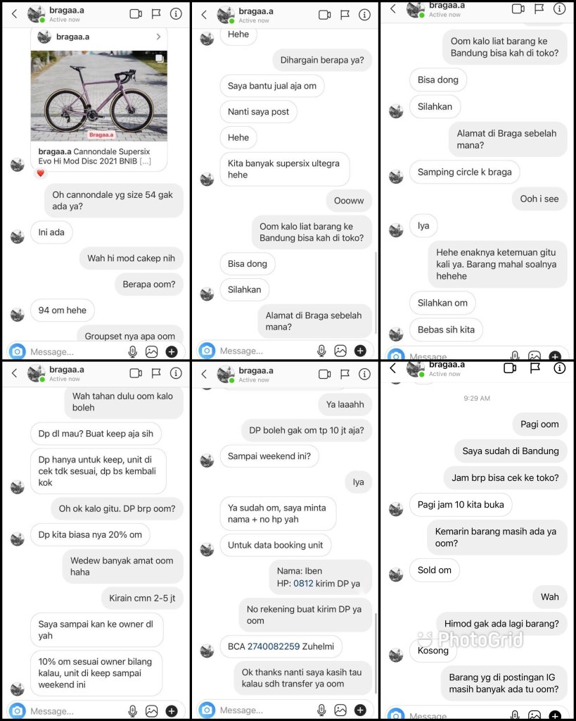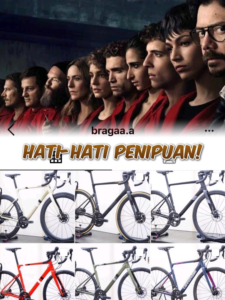 Sekarang banyak nama akun lain. Selain Bragaa. Tapi modusnya sama. Ciri-cirinya: (a) harga sepeda di bawah pasar; (b) field comments di post-nya ditutup: orang tidak bisa komen; (c) tidak bisa di tag IG account nya. Hati-hati ya semua 🙏
