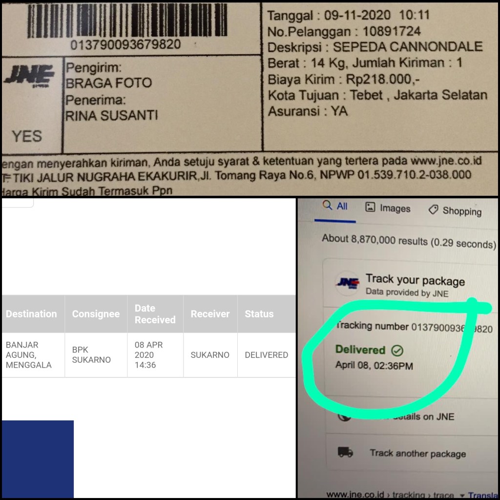 Menunggu beberapa hari, sepeda impian tak kunjung datang. Rina mulai khawatir dan curiga. WhatsApp dan DM ke Instagram toko pun tidak dijawab. Saat mengecek nomor resi melalui situs ekspedisi, Rina menemukan kalau nomor tracking adalah nomor lawas untuk barang yang sudah terkirim di bulan April! Puncaknya, akun Instagram @bragaa.a pun mem-blok Rina. Confirmed sudah, ini penipuan.