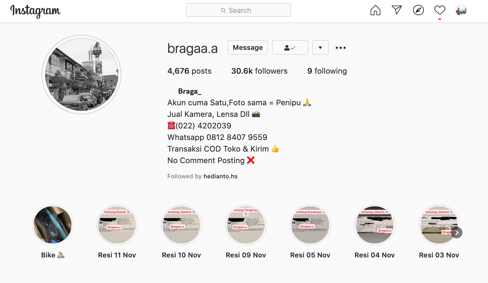 Akun @bragaa.a ini memiliki followers lebih dari 30.000. Dan walaupun tidak ada testimoni (ya gimana ada testimoni, tipu-tipu semua), akun cukup pintar dengan membagikan bukti-bukti pengiriman resi di IG story archives, yang seolah-olah menunjukkan banyaknya transaksi yang berhasil dilakukan.