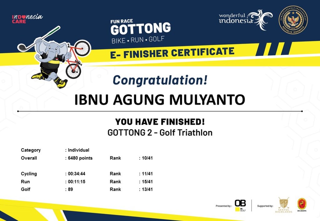 Demikianlah cerita saya dari partisipasi di GOTTONG golf triathlon kedua kemarin. Kalau diadakan lagi saya pasti akan kembali join. Event-nya menyenangkan, panitianya professional dan rapi, dan tantangannya memberi kepuasan tersendiri untuk menjadi finisher. Apalagi di 10 besar!