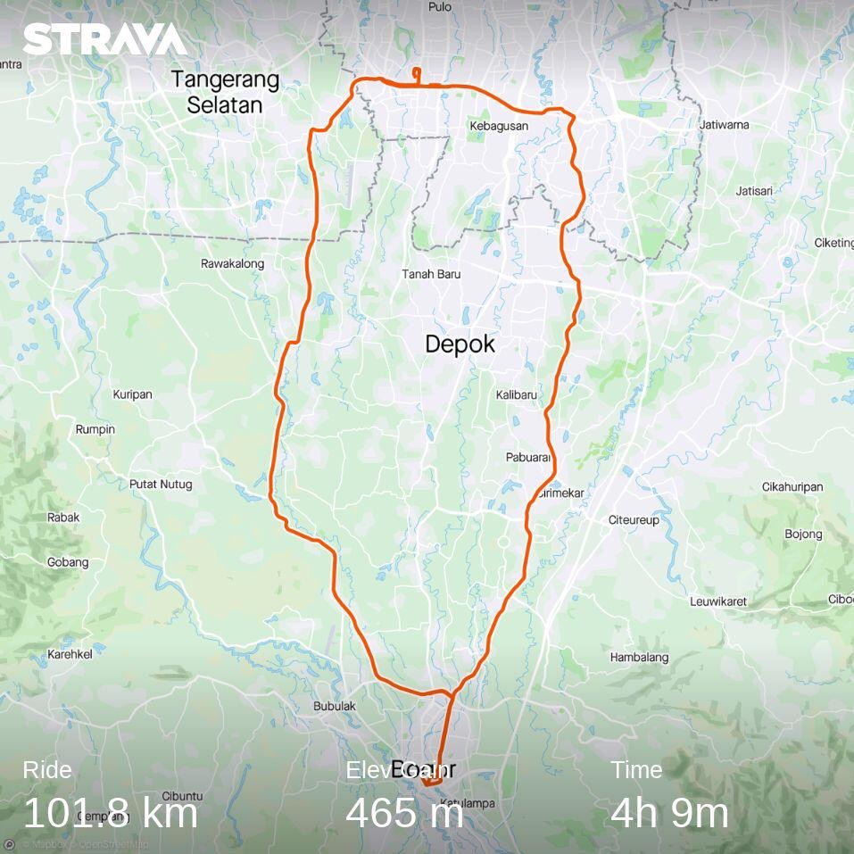 Jalur pulang sih secara teorinya turun terus sampai Jakarta. Tapi Jalan Raya Bogor adalah jalan yang sibuk. Walau masih di musim pandemi, kendaraan berlalu lalang di sana sangat banyak. Apalagi semakin siang. Jadi walaupun kita awalnya berniat untuk pulang dengan average speed 30 km/jam, kenyataannya waktu pulang malah lebih lama dari kita berangkat. Karena di beberapa lampu merah kita kena macet. Ditambah lagi dengan kondisi badan yang semakin lelah, beberapa kali kita harus berhenti menunggu segenap rombongan. Memastikan tidak ada yang ketinggalan dan gak tahu jalan pulang. Kan berabe.