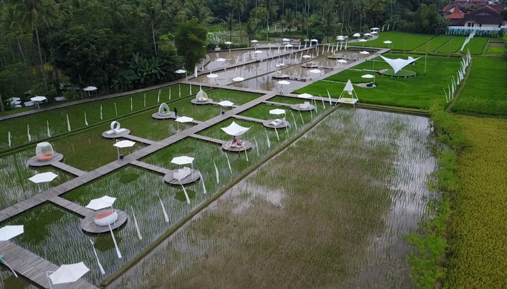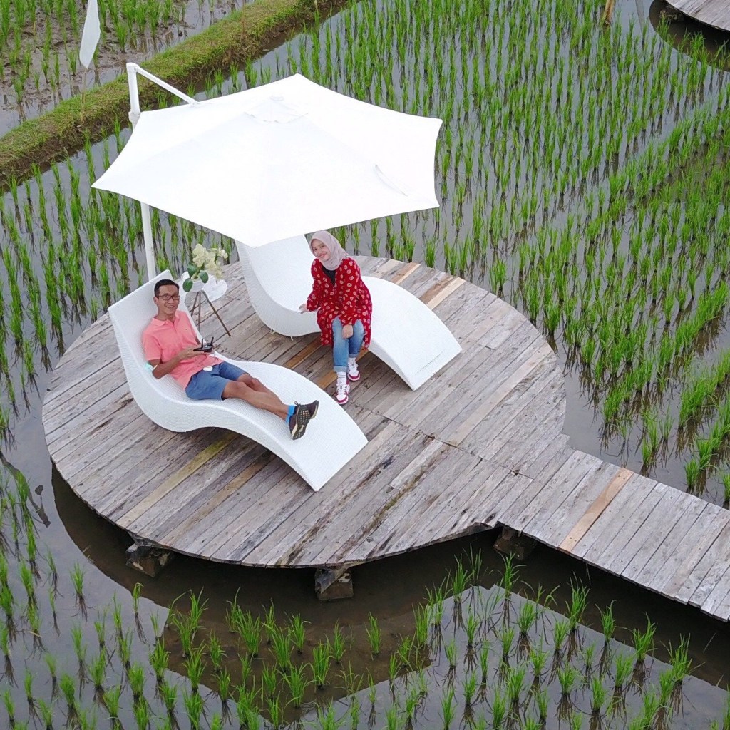 Sesampainya di sana, barulah kita sadar kalau Svargabumi bukanlah restoran saudara-saudara! Tempat ini adalah spot foto kekinian. Terdiri dari spot kursi dan tenda yang artistik di tengah sawah. Yang dihubungkan oleh jembatan kayu. Memang jadi cantik.
