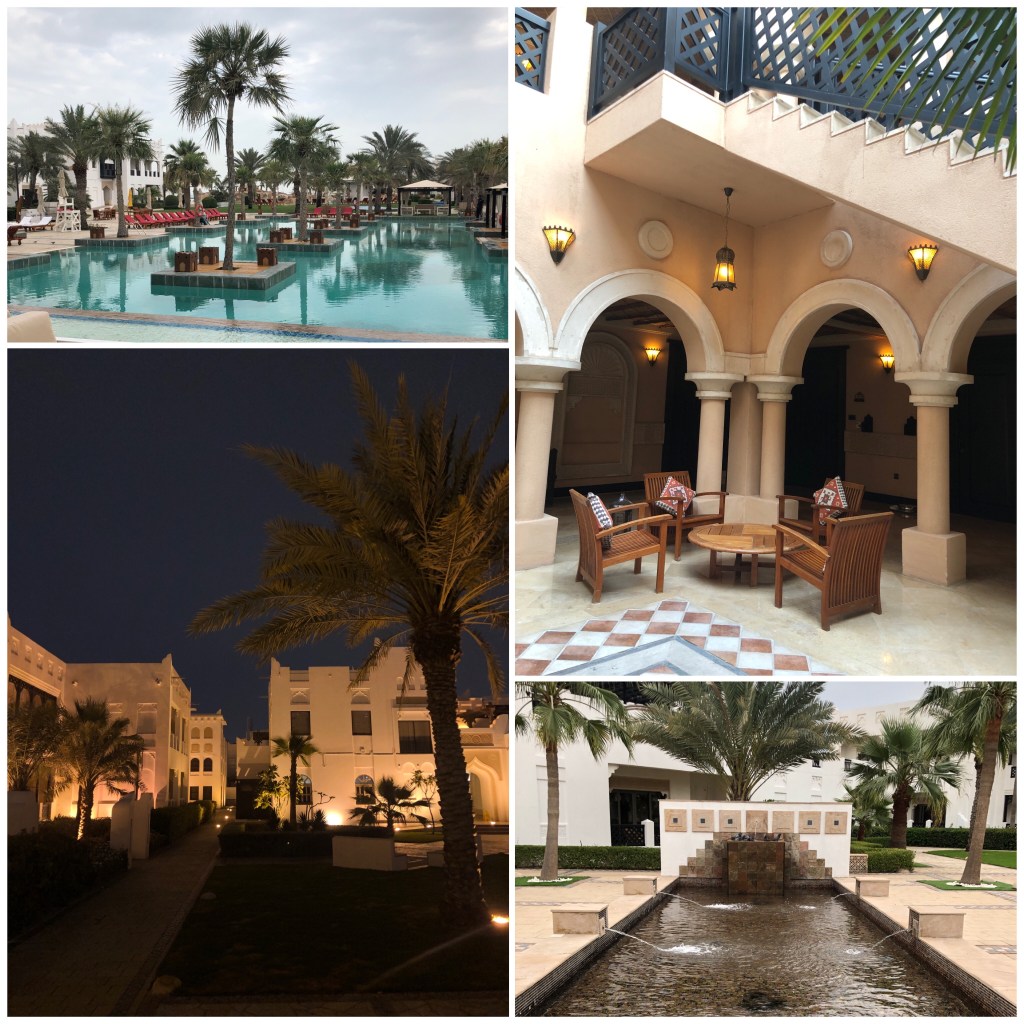Sekitar 30 menit saya sampai di hotel saya. Saya dipesankan kamar di Sharq Village & Spa. Hotel bintang 5 yang dikelola Ritz Carlton. Saya sampai hotel menjelang maghrib. Walau langit sudah menggelap, saya masih bisa sedikit melihat sekeliling. Hotel saya arsitekturnya seperti rumah tradisional warga Timur Tengah. Kompleksnya cukup luas. Untuk menuju kamar saya, saya harus berjalan di luar gedung lobby utama untuk menuju salah satu villa. Satu villa terdapat mungkin sekitar 6-8 kamar, termasuk kamar saya. Bagus sih desainnya, khas daerah sini. Kesannya saya sedang berada di tengah compound di padang pasir. Eh, bukan kesannya ding… Memang benar di tengah padang pasir 🙂