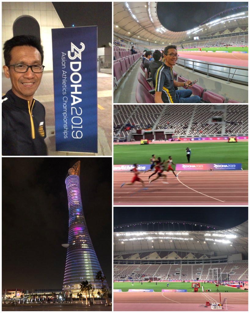 Saya sampai di Stadion jam 19.15. Sempat foto-foto dulu sebelum mencari pintu masuk ke dalam stadion. Event Kejuaraan Atletik Asia ini gratis. Dan memang, sedikit sekali yang menonton. Secara Qatar bukan negara besar. Jumlah penduduknya saja sekitar 2.5 juta. Doha sendiri tidak sampai 1 juta penduduknya. Jadi tidak mengherankan, sungguh sulit untuk mengisi penuh satu stadion sepakbola yang notabene berkapasitas 30.000-50.000. Apalagi untuk event Kejuaraan Atletik seperti ini.