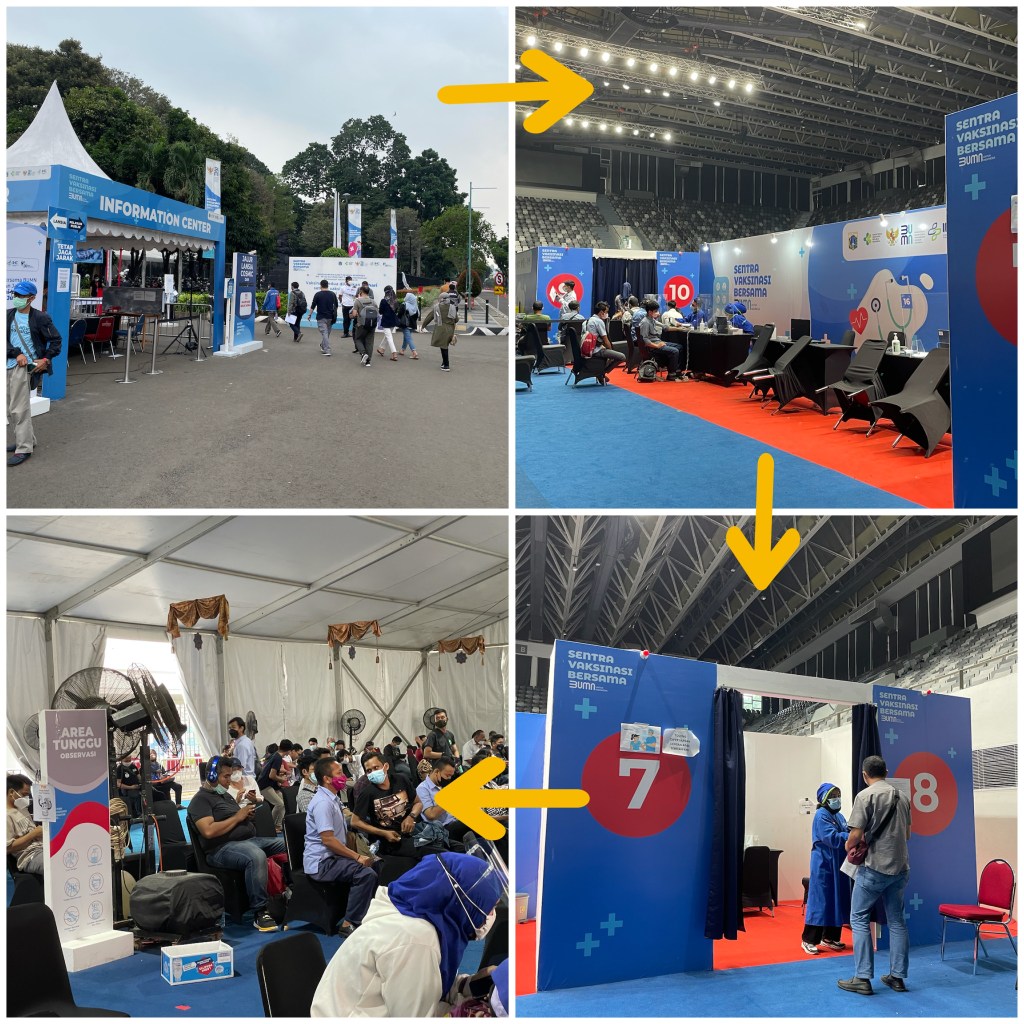 Setelah administrasi formulir sudah benar tercatat, hanya menunggu sebentar, kita sudah dibawa masuk ke aula besar di mana ratusan orang yang akan divaksin sudah mengantri. Tapi karena proses vaksinasi BUMN ini sudah berlangsung beberapa bulan, prosesnya efisien sekali. Kami tidak harus menunggu lama. Petugas sudah mengarahkan untuk menuju bilik-bilik yang kosong.