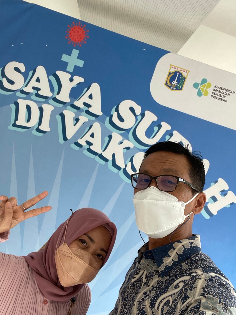 Alhamdulillah, saya dan istri baik-baik saja. Jadilah kami bergegas pulang. Dan tidak lupa, untuk foto dulu di backdrop yang disediakan. Alhamdulillah, kami sudah divaksin!