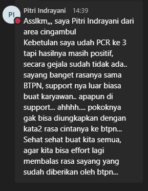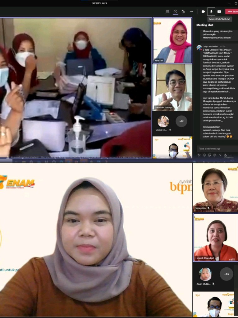 Ekspresi spontan ini terekam dalam chat video conference di acara “Ekspresi Hati” kemarin Jumat. Saya sebagai salah satu wakil Manajemen membesuk secara virtual karyawan BTPNS yang terpapar COVID, baik yang sudah sembuh, ataupun masih isoman.