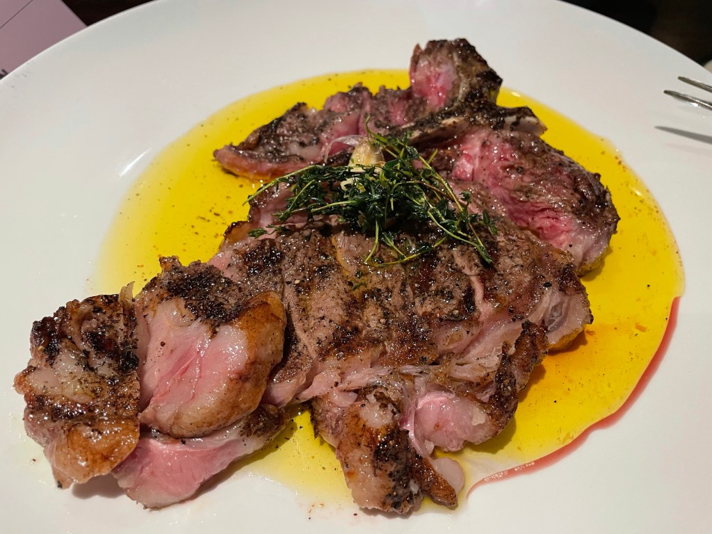 Tak lama kemudian, datang lah pesanan kita. Steak Bistecca kami sudah dipotong-potong ke dalam bit size, dan saat disajikan kemudian disiram dengan mentega cair. Asap mengepul karena steak masih panas dari nampan penggorengan.