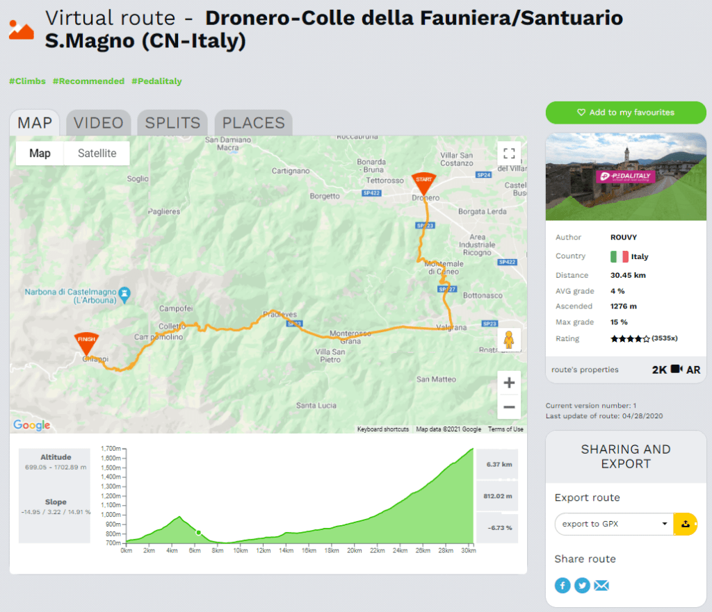 Pertama, karena sebetulnya saya sudah merencanakan untuk menyelesaikan prasyarat rute wajib di weekend ini. Rute yang berat, rute wajib Dronero-Colle della Fauniera. Jaraknya sih “hanya” 30,45 km . Tapi di rute ini kita harus menanjak 1.275 meter. Dan ini terjadi di paruh akhir perjalanan. Saat tenaga sudah cukup terkuras, it’s total climbing all the way. Dengan gradient yang cukup terjal dari 6-15%. Total 2 jam lebih saya menyelesaikan rute ini di hari Sabtu. Badan terasa sakit semua.