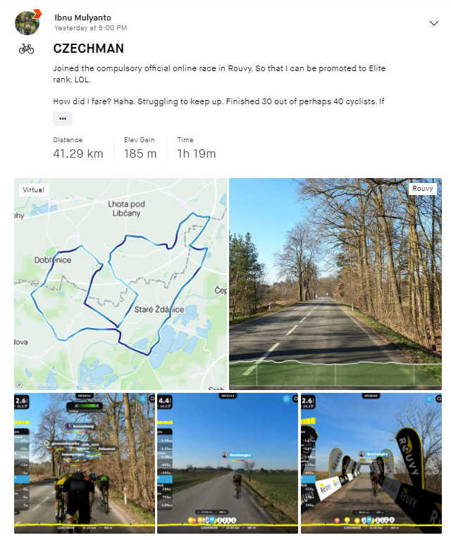 Dan kedua, dengan energi yang sudah banyak terkuras di hari Sabtu, saya memaksa diri mengikuti official online race di keesokan harinya, Minggu sore. Karena Rouvy season berakhir di akhir bulan September ini. Tidak ada waktu lagi. Dengan kesibukan kantor ke depan, saya tidak mungkin dapat meluangkan waktu di hari kerja untuk gowes virtual.