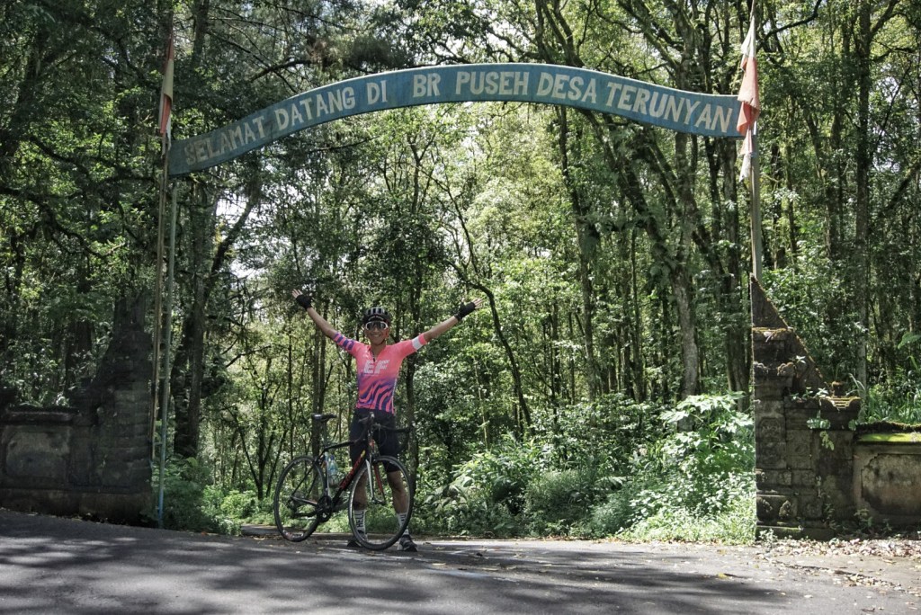 Di 10 km memang puncak perjuangan. Walaupun suasana hutan pinus membuat gowes semakin syahdu, tapi tanjakannya bukan kaleng kaleng. Kalau tidak ditolong Bli Kadek dengan mendorong punggung saya di belakang saat tanjakan semakin berat, pasti saya sudah menuntun.