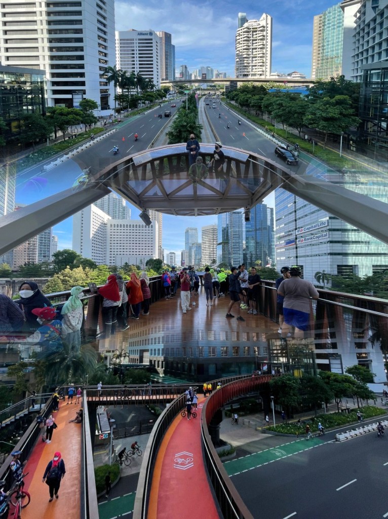 Betul saja, pagi ini saat saya menyempatkan diri mengunjungi JPO Phinisi saat lari pagi di sekitar Sudirman, lokasi sudah ramai dipenuhi para goweser dan runner yang melintasi Sudirman.