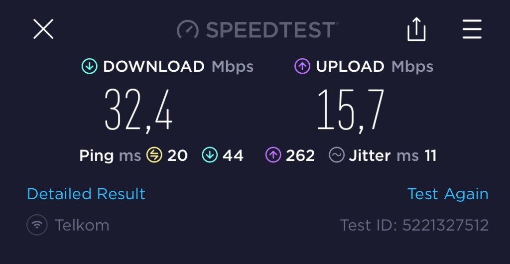 Alhasil, kecepatan internet di rumah saya sekarang menjadi meningkat pesat. Kalau sebelumnya di lantai 2 maksimal hanya 10 Mbps, saat ini di dalam kamar saya bisa mendapatkan sampai lebih dari 30 Mbps (paket internet saya maksimal kecepatannya adalah 50 Mbps). Bahkan di kamar mandi kamar saya pun yang sebelumnya sering jadi “blank spot” masih bisa mencapai lebih 30 Mbps.