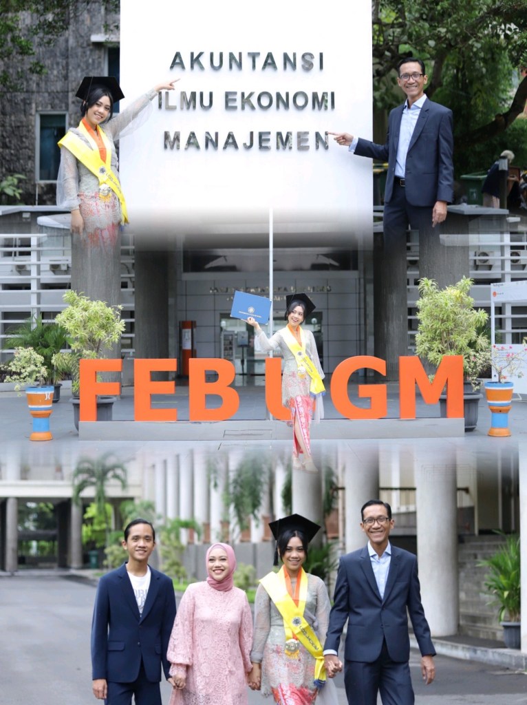 Penyesalan yang kedua adalah karena saat wisuda kemarin, waktu untuk foto-foto sangatlah sempit. Acara wisuda fakultas berakhir jam 2. Padahal pesawat kita berangkat jam 16.30. Sedangkan airport baru Yogya sekarang butuh 1,5 jam perjalanan. Jadilah kita tidak punya waktu leluasa untuk mengabadikan momen istimewa. Boro-boro di spot ikonik, seperti Balairung UGM, foto di sekitar kampus FEB UGM saja tidak bisa mendapatkan angle yang baik, karena sangat ramai. Jadi mustahil untuk mendapatkan foto murni tanpa photo bombs.