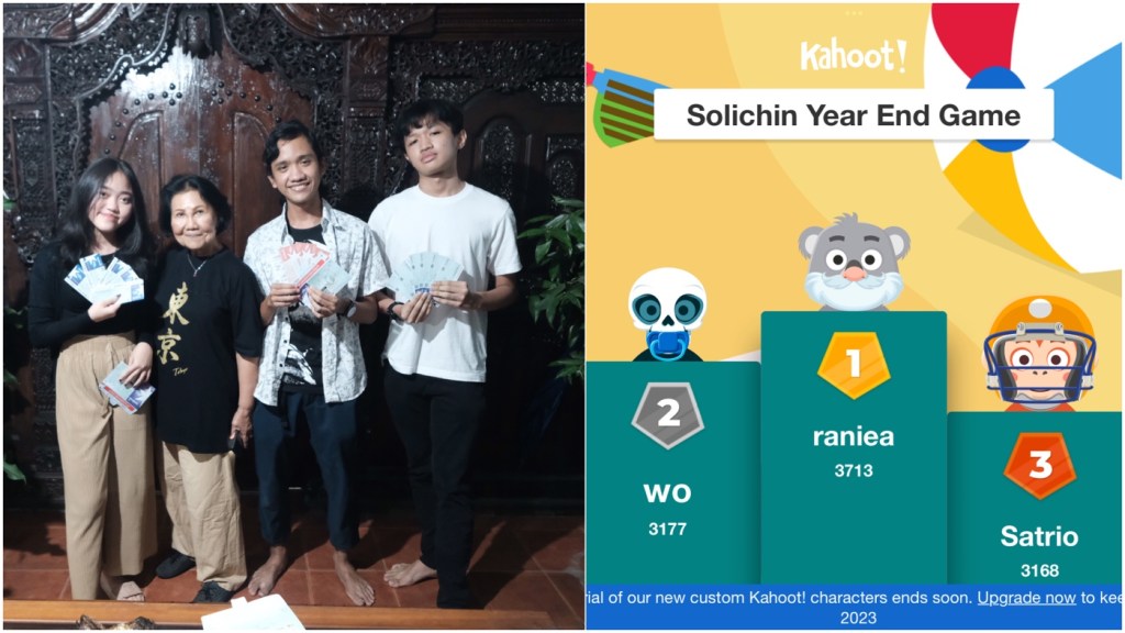 Untuk menambah keceriaan malam ini, saya berinisiatif mengadakan lomba quiz menggunakan aplikasi Kahoot. Seluruh anggota keluarga ikut. Dari Eyang sampai cucu-cucu generasi milenial. Tantangannya adalah membuat soal yang cukup seimbang. Sehingga setiap generasi memiliki kemampuan untuk kompetitif menjawab soal-soal yang mungkin lebih favorable untuk generasi tertentu.