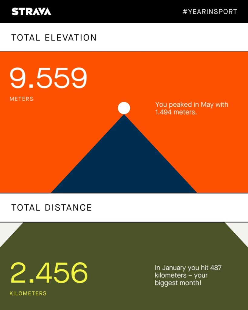 - Total Distance: Aiming to do 4.000 km, I only managed 2.456 kilometers (down from 3.951 km in 2021).