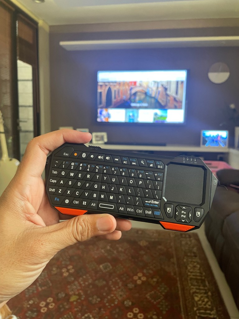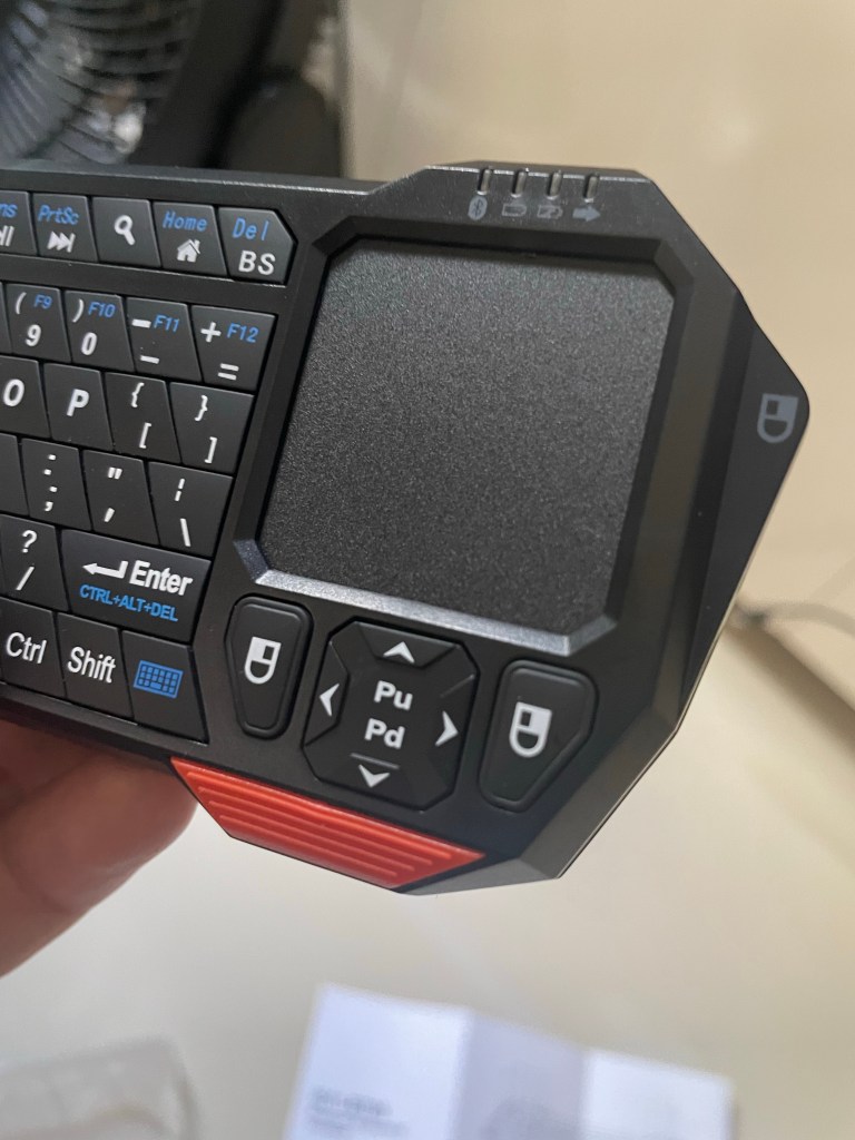 Sampai kemudian saya menemukan solusi yang lebih baik: this China-made mini keyboard with trackpad. Merk-nya Seenda. Seri IS11-BT05. Not a household name. But it works wonderfully.