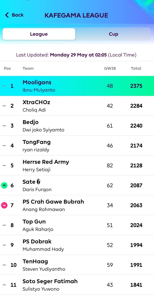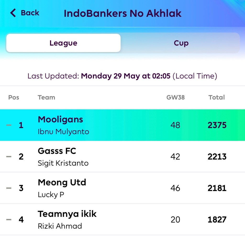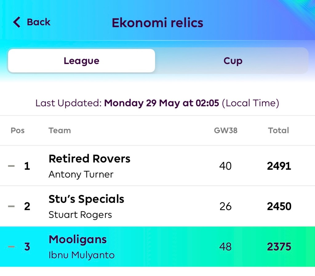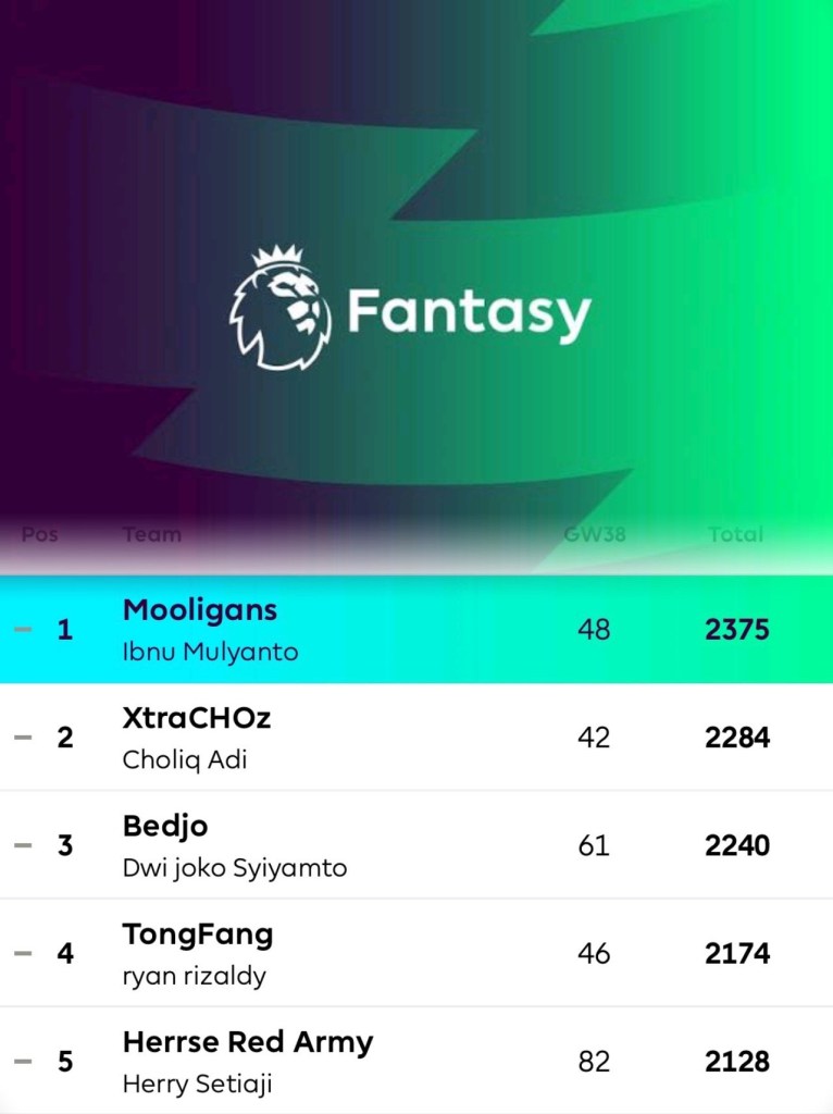 Musim sepakbola Premier League 2022-2023 telah berakhir. Begitu pula dengan Fantasy Premier League. Permainan mingguan yang cukup menyita konsentrasi saya. Untuk memilih pemain yang diprediksi akan bermain bagus di pertandingan liga setiap minggunnya.