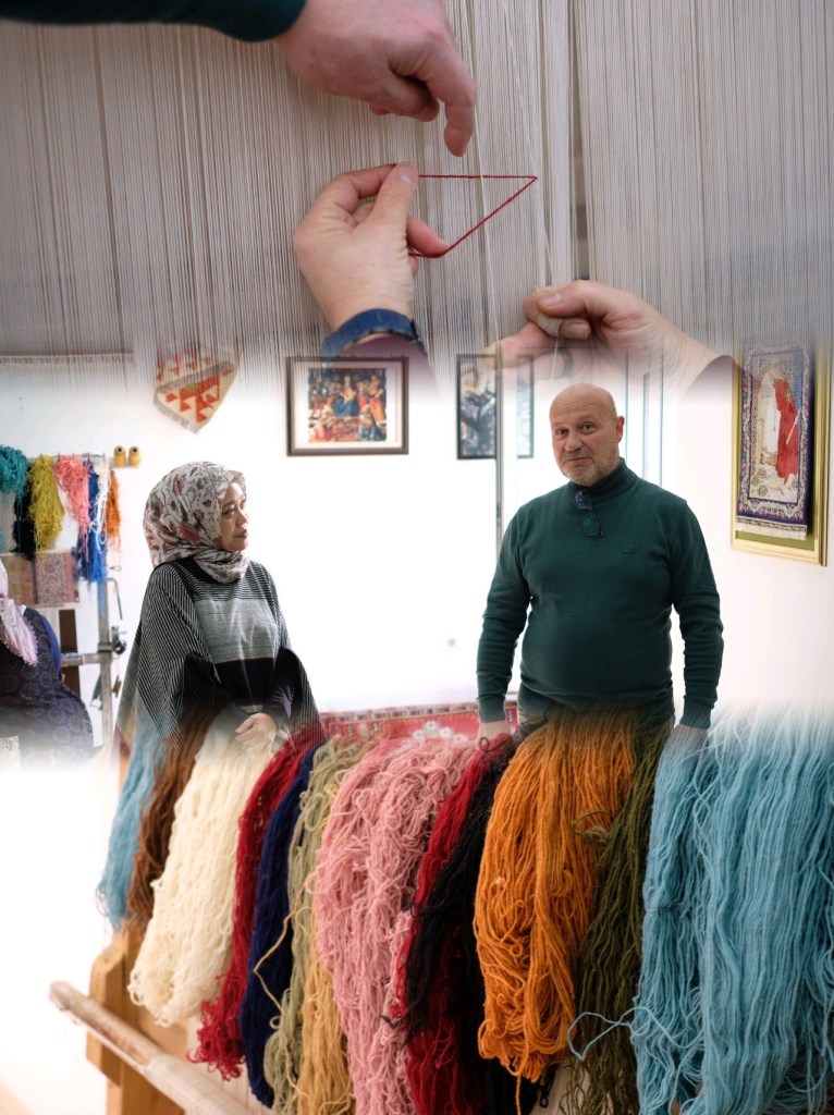 Tengah: Elok saat berkunjung ke Workshop Karpet di Cappadocia, Turki, Bawah: benang wol sebagai bahan dasar karpet Turki