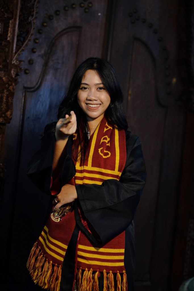 Mbak Aya peserta paling bermodal. Menjadi Hermione dari film Harry Potter, Mbak Aya membeli jubah Hogwarts. Melengkapi magic wand dan slayer yang dibelinya saat berkunjung ke Universal Studio.