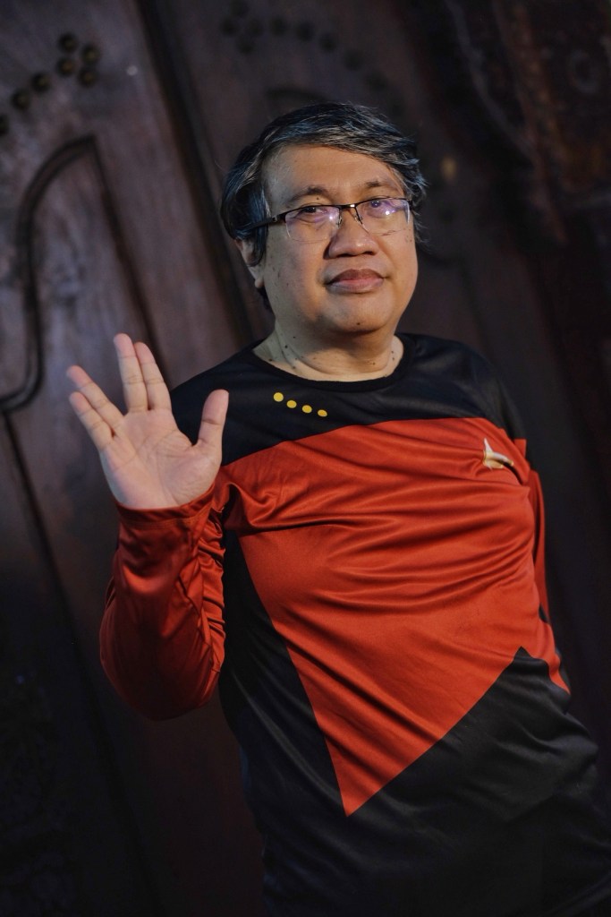 Mas Ugiek, fans berat Star Trek, tidak lupa mngeluarkan simpanannya kostum USS Enterprise. Dek Endah dan Rania kompak berseragam Mario dan Luigi.