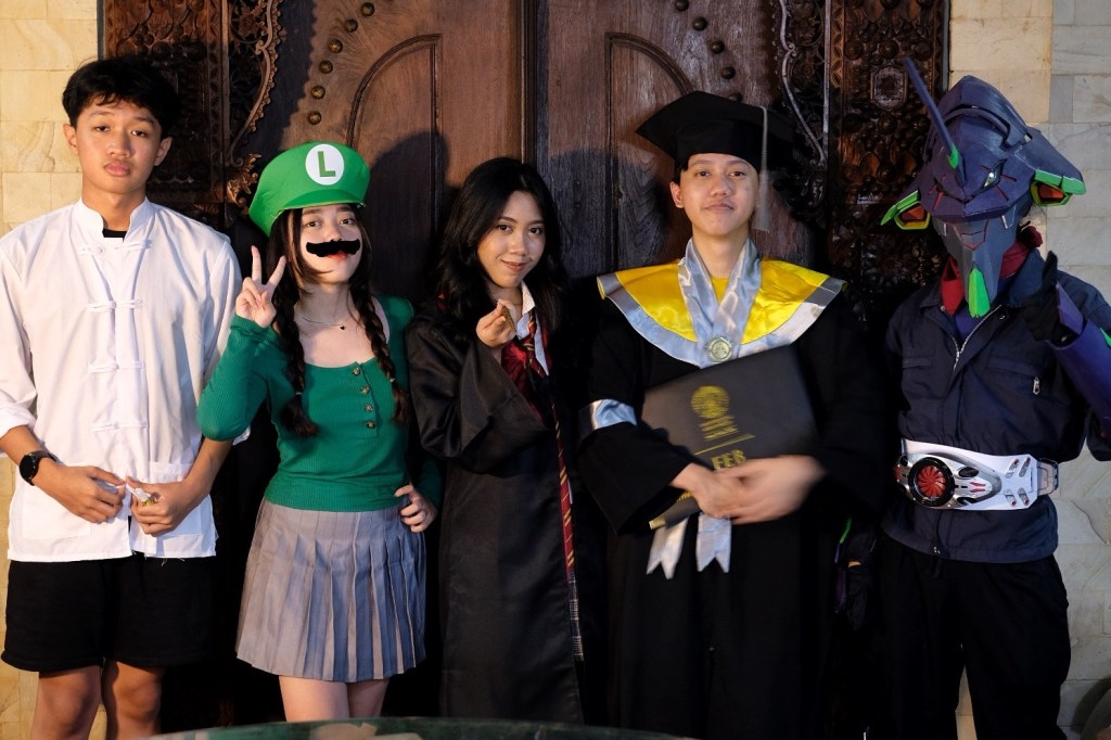 Yang paling menggelikan Rangga. Percaya diri pakai kostum Wisuda Universitas Indonesia. Dia bilang ini kostum paling mahal. “Butuh empat tahun buat dapetinnya”. Bener juga. Hahaha.
