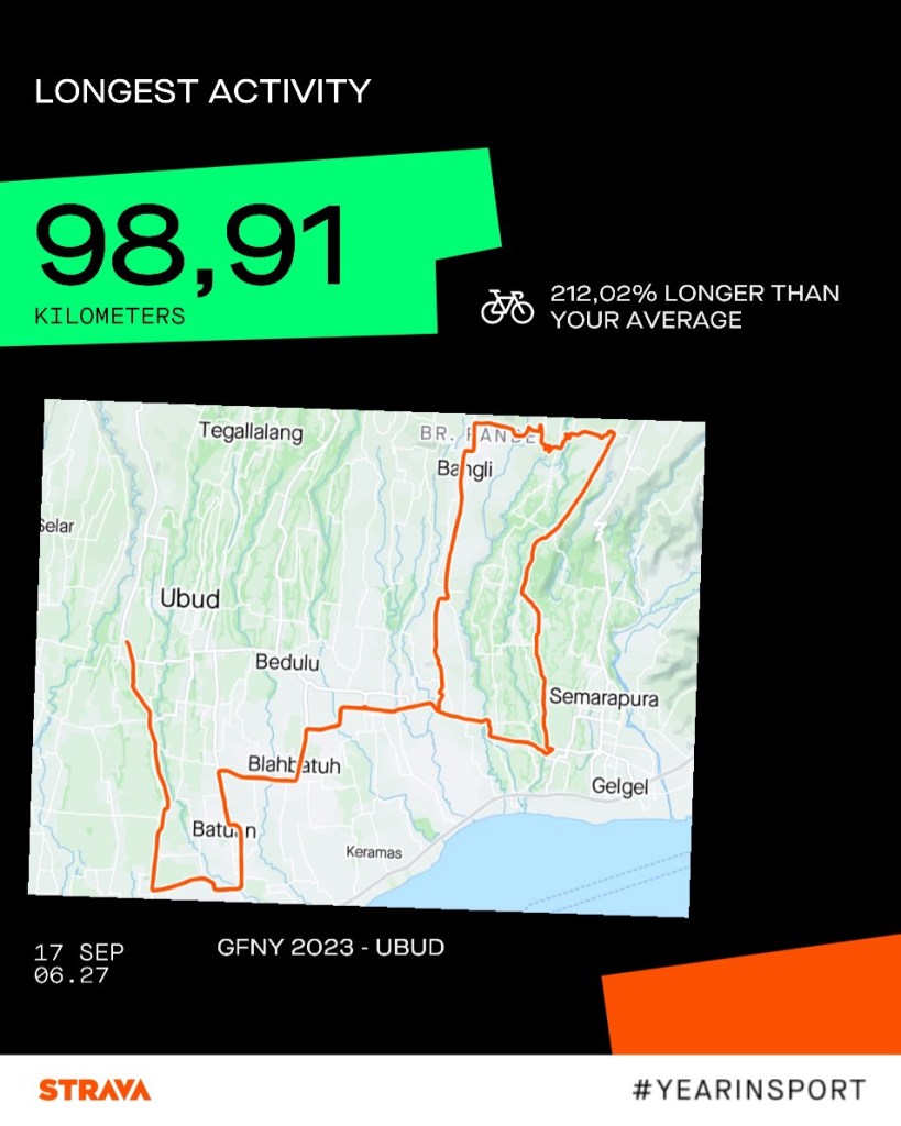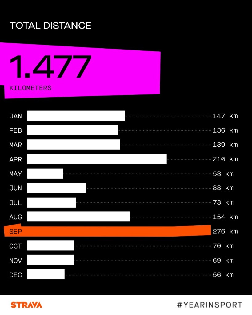 The total distance was down though. Because I didn’t do a lot of long rides. Or cycling for that matter. The longest distance I took was during GFNY Ride, which I rode for 98.91 km. I spent more time running than cycling. 21% of active days in running, and only 11% of them are cycling. Hence total distance is just 1.477 km (compared to 2.456 km last year)