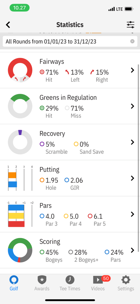 Anyway I only played 10 rounds of golf. My scoring average was 89.1. My best round was in Emeralda in September, playing 83. But then couldn’t find any consistency towards the end of the year. Hence my handicap now is down to 11.9 (based on GolfShot stats)