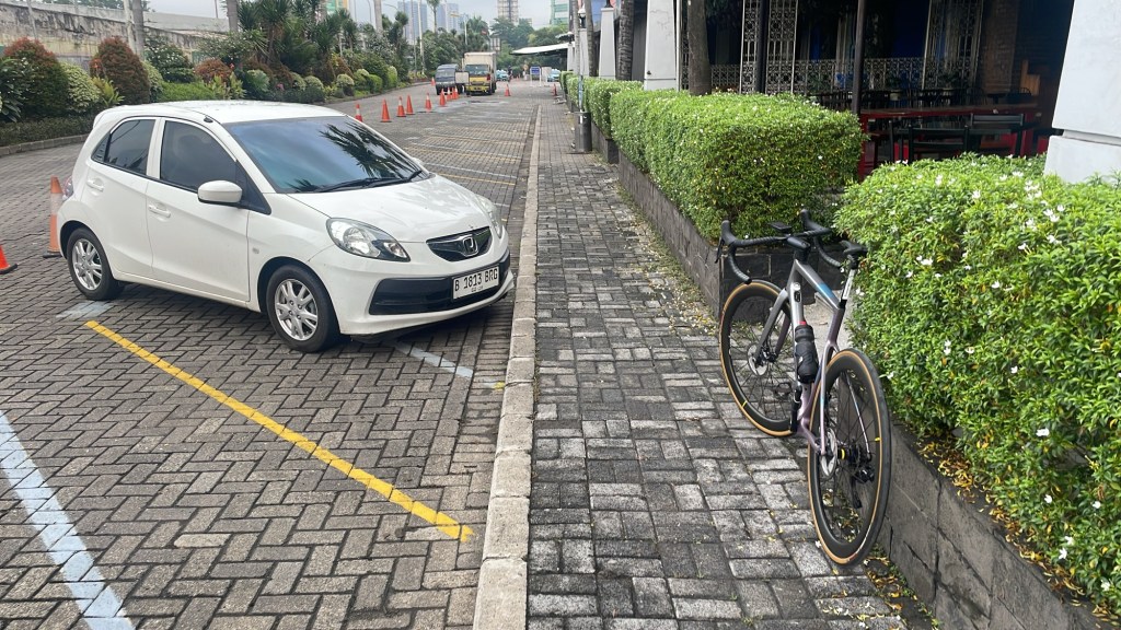 Setelah selesai sarapan, hampir jam 11 kita siap untuk cabut balik ke Jakarta. Sialnya, ternyata ban depan saya kempes! Saya sudah melontarkan niat untuk “loading” saja. Panggil Grab untuk angkut sepeda pulang ke Jakarta.