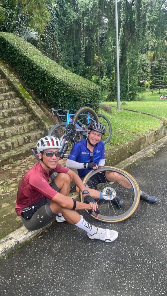 Untungnya, di rombongan saya ini, walaupun tidak peduli konten, ada dua orang yang lulusan Audax. Unsupported Ride. Jadi mereka berdua membawa peralatan lengkap. Mulai dari kunci sepeda, ban dalam, sampai dengan tabung nitrogen untuk isi angin ban. Berkat bantuan dan kesigapan mereka, dalam waktu setengah jam, sepeda saya sudah siap digowes lagi balik ke Jakarta! Thank you Coach Ira dan Alwin!