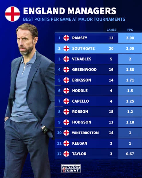 Dan hari minggu besok, Southgate berpeluang menjadi pelatih Timnas Inggris tersukses sepanjang masa, apabila berhasil membawa Harry Kane dan kawan-kawan menjuarai Piala Eropa.