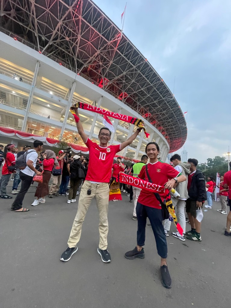 Saya pun mengajak Rafif, anak saya, yang sebetulnya bukan penggemar sepakbola. Namun karena ini untuk mendukung Timnas Indonesia yang akhir-akhir ini menanjak prestasinya, sepertinya Rafif jadi ikut bersemangat.