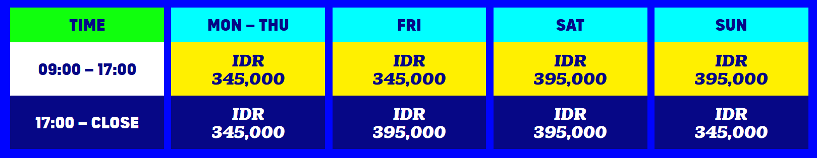 Top Golf buka setiap hari dari jam 9 pagi. Tutup di jam 12 malam di hari Jumat dan Sabtu. Dan untuk hari lainnya di jam 10 malam. Untuk bermain di sini rate yang dikenakan adalah per jam. Di Regular Bay, harganya adalah Rp 345.000 per jam di hari Senin-Kamis, dan Rp 395.000 per jam di malam Jumat dan Weekends, kecuali Minggu malam. Cukup mahal, oleh karenanya dianjurkan main bareng-bareng, agar bisa patungan dalam membayar. Tapi yang masih setaraf lah dengan pengeluaran alternatif hang-out.