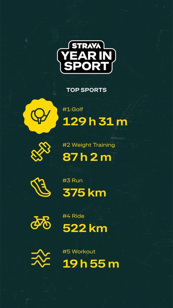 - Total distance was 1.508 km, and it was 2% up from 2023. Again, I’m sure golf played big part, as I easily walked >10km for every golf round I played. Running contributed 375 km, and Cycling was 522 km.