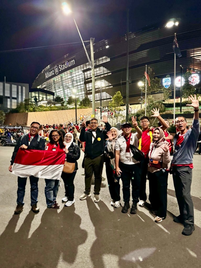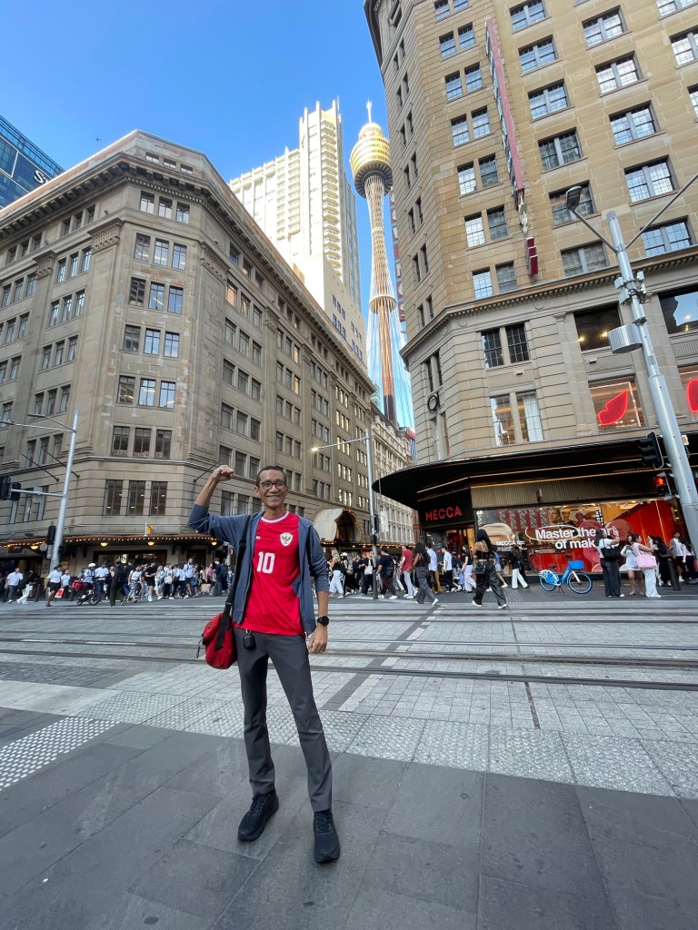 Dan suasana “Merah Putih” sudah terasa sejak pagi hari di downtown Sydney. Di pusat kota dekat Queen Victoria Building dan sepanjang jalur tram, supporter dan diaspora Indonesia banyak terlihat dengan kaos merah putih. Semakin sore semakin banyak.