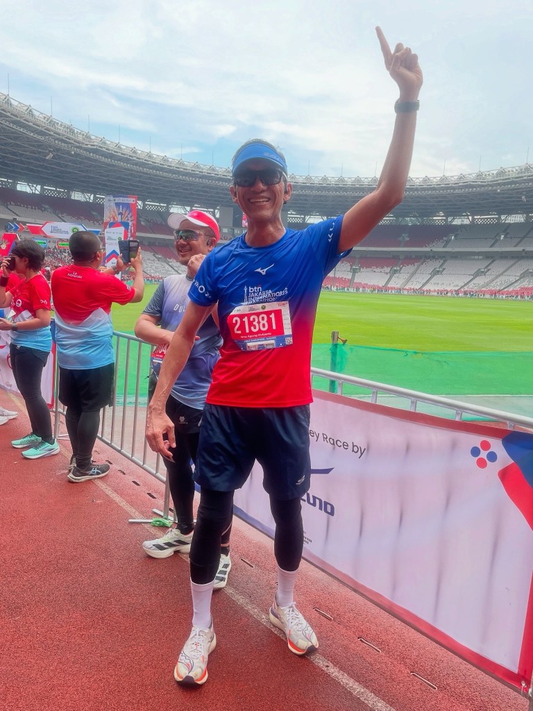 Tapi saya rasa semua rasa lelah itu terbayar saat kita masuk ke Pintu Barat GBK. Ratusan orang penonton dan cheering group berbaris sepanjang jalan. Dan kita diarahkan lari memasuki dalam stadion GBK. Di mana kita harus melakukan hampir 3/4 putaran dari running track sekitar lapangan sepak bola untuk sampai di garis finish. Benar-benar sensasi finish yang mungkin hanya bisa terjadi di Jakim. Bravo!