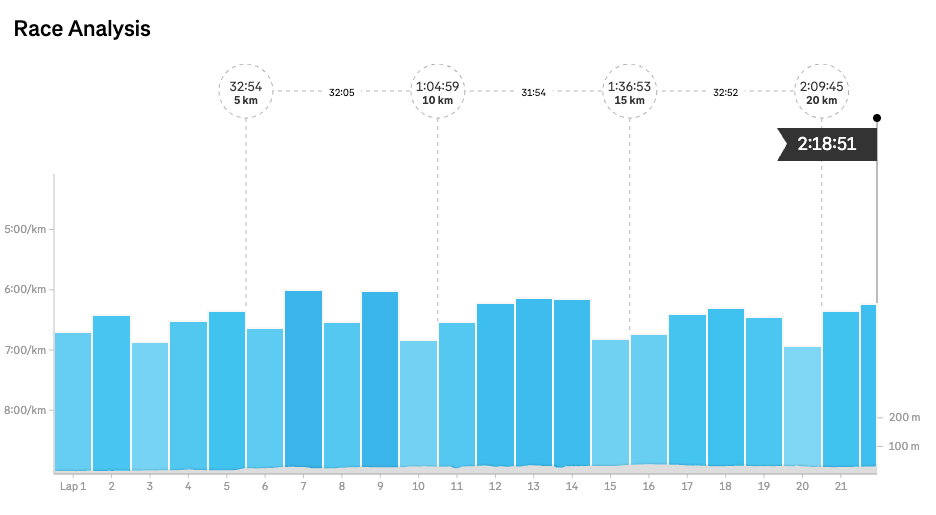 - Waktu di Strava saya mencatat lari saya di lomba kali ini 2 jam 18 menit 51 detik. Jauh dari Personal Best saya. Tapi saya tidak kecewa, karena memang tidak berharap untuk bisa memecahkan PB di lomba pertama usai cedera. Dan ternyata dengan pace 6:29 menit per km, saya justru memenuhi target pace saya berlari di bawah 6:30.
