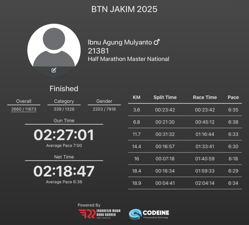 Akhirnya setelah sembuh dari cedera lutut di akhir tahun lalu, saya mengikuti lomba lari pertama saya di tahun 2025 ini di BTN Jakarta International Marathon (JAKIM).
