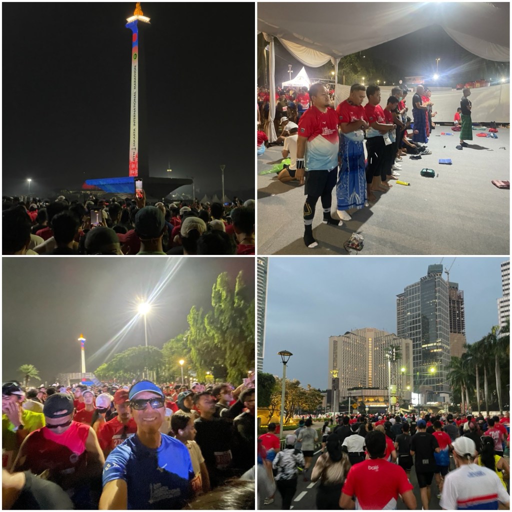 Untung saja waktu masih cukup untuk saya sholat dan bergegas ke garis start. Walaupun mepet. Mungkin tinggal 2 menit ke pukul 5.15, waktu start untuk kategori Half Marathon yang saya ikuti.